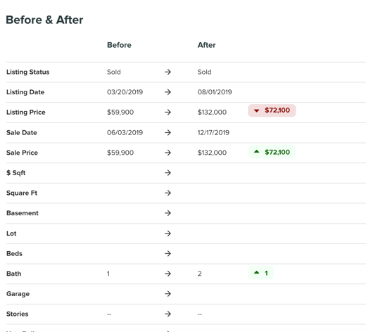You'll also see in the Listing Insights and "Before & After" that the property was sold in 2019, however, that is not the most recent sale date as seen in the Transaction History picture from lower down on the property card in XLeads. The most recent sale date is in 2023, seen in both software's transaction histories. This inconsistency caused a little bit of confusion on my part.